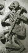 Klapperbein weiß, dass hinter ihm keiner mehr entrinnen kann. Unerbittlich, die Schalmei blasend und das Stundenglas empor haltend, ruft er zum letzten Tanze. Grausig weht ein letztes Haarbüschel am sonst kahlen Schädel.