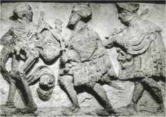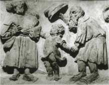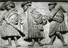 Es folgen die Stände: Ratsherr, Steinmetz, Soldat mit Streitaxt, Bauer mit Dreschflegel, auch der mühselig hinterdrein humpelnde Bettler mit Stelzfuß: